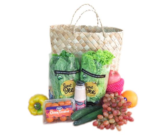 The basket includes an assortment of: Leetuce Romaine, Lettuce Green Ice, Cherry Tomato, Capsicum Yellow, Grapes, Dressing, Apple, Orange