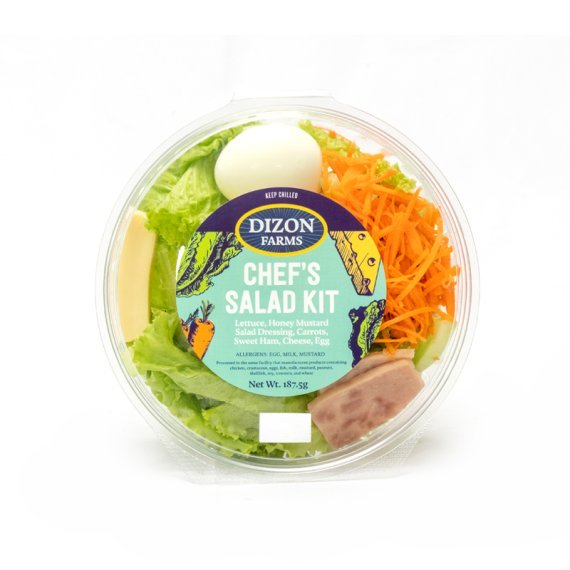 Pack Size: 187.50 grams Ingredients: Lettuce Carrots Sweet Ham Sliced Cheese Boiled Egg Dressing: Dizon Farms Honey Mustard Salad Dressing, Allergen Information: Egg, Milk, Mustard Processed in the same facility that manufactures products containing chicken, crustacean, eggs, fish, milk, mustard, peanuts, shellfish, soy, treenuts and wheat.