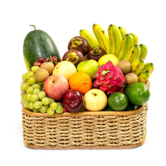 The basket includes an assortment of: Lacatan,  Chico, Avocado, Pakwan Black Beauty, Golden Pears, Dragon Fruit, Honey Melon, Century Pears, Washington Apple, Green Apple, Mangosteen, Solo Papaya, Pomelo, Grapes Red, Grapes Black